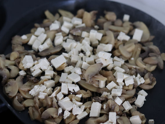 2. חותכים לקוביות קטנות את הטופו, קוצצים פטריות ומעבירים למחבת. מטגנים כ-10 דקות.