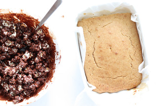יוצקים לתבנית מרופדת בנייר אפייה, אין צורך לשמן. מעבירים לתנור למשך 35-40 דקות