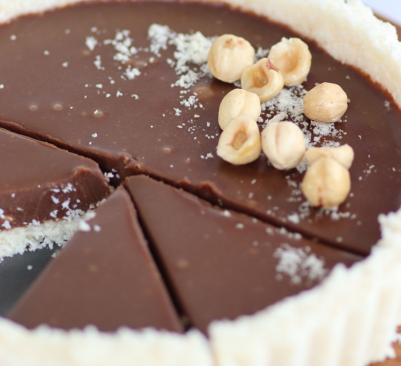מוציאים את הטארט מקרור ויוצקים מעל האגוזים, התנועה סיבובית עדינה מפזרים את השוקולד.